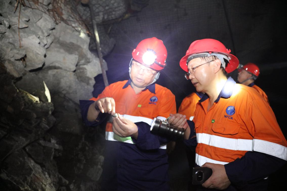 在中色非矿,奚正平董事长一行来到中色非矿主西矿体井下新盘区二盘区573mI采场、400mL主维修硐室,实地查看了采场支护、掘进通风、爆破作业、设备维保和文明生产等情况。随后参观了东南矿体控制中心、赞比亚实验室、员工技能培训学校,仔细询问生产工艺流程、信息化建设、经济技术指标、科研创新、安全警示教育等工作情况。